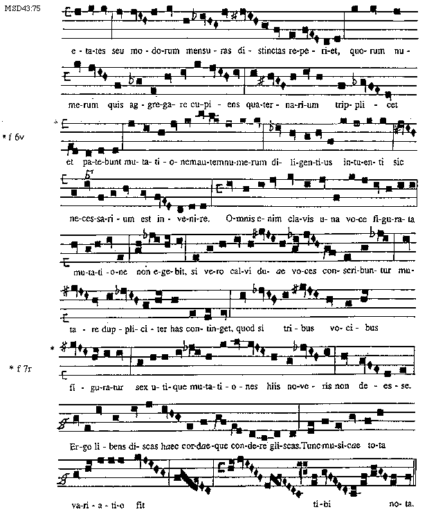 [75][MSD43:75; text: varietates seu modorum mensuras distinctas reperiet, quorum numerum quis aggregare cupiens quaternarium triplicet, f 6v, et patebunt mutationem autem numerum diligentius intuenti sic necessarium est invenire. Omnis enim clavis una voce figurata mutatione non egebit, si vero calvi duae voces conscribuntur mutare dupliciter has continget, quod si tribus vocibus, f 7r, figuratur sex utique mutationes hiis noveris non deesse. Ergo libens discas haec cordaeque condere gliscas. Tunc musicae tota variatio fit tibi nota.]