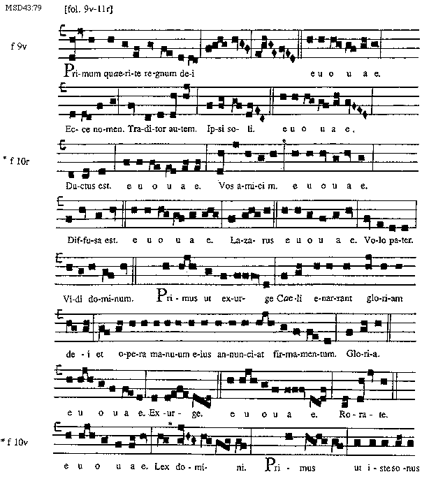 [MSD43:79; text: [fol. 9v-11r], f 9v, Primum quaerite regnum dei euouae. Ecce nomen. Traditor autem. Ipsi soli. Ductus est. Vos amicim. f 10r, Diffusa est. Lazarus, Volo pater. Vidi dominum. Primus ut exurge, Caeli enarrant gloriam dei et opera manuum eius annunciat firmamentum. Gloria. Exurge. Rorate. f 10v, Lex domini. Primus ut iste sonus]