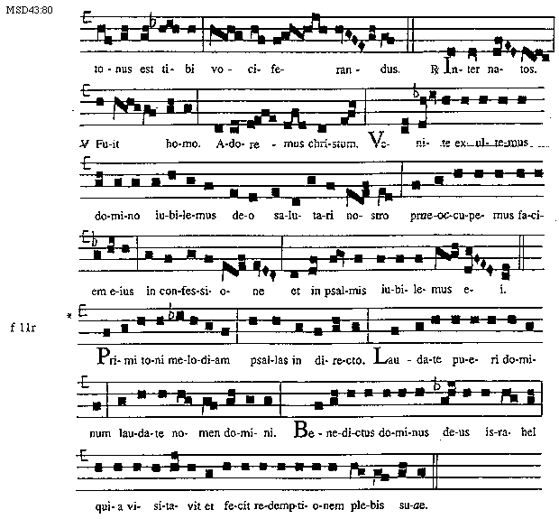 [80][MSD43:80; text: tonus est tibi vociferandus. Responsorium Inter natos. Versus Fuit homo. Adoremus Christum. Venite exultemus domino iubilemus deo salutari nostro praeoccupemus faciem eius in confessione et in psalmis iubilemus ei. f 11r, Primi toni melodiam psallas in directo. Laudate pueri dominum laudate nomen domini. Benedictus dominus deus Israhel quia visitavit et fecit redemptionem plebis suae.]