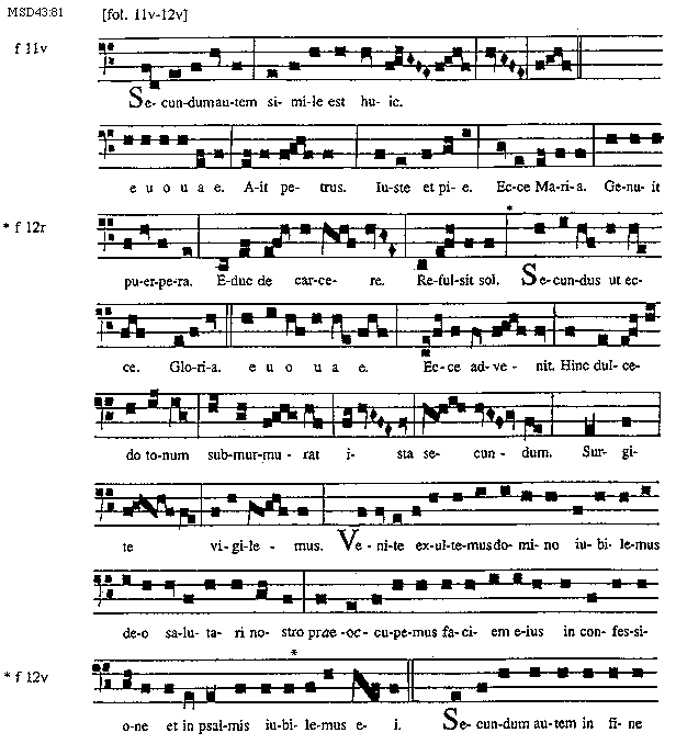 [MSD43:81; text: [fol. 11v-12v], f 11v, Secundum autem simile est huic. euouae. Ait Petrus. Iuste et pie. Ecce Maria. Genuit puerpera. Educ de carcere. Refulsit sol. f 12r, Secundus ut ecce. Gloria. Ecce advenit. Hinc dulcedo tonum submurmurat ista secundum. Surgite vigilemus. Venite exultemus domino iubilemus deo salutari nostro praeoccupemus faciem eius in confessione et in psalmis iubilemus ei. f 12v, Secundum autem in fine]