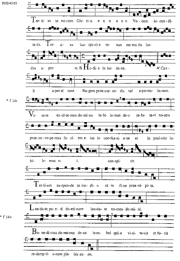 [83][MSD43:83; text: Tertius ut vocem. Gloria. euouae. Vocem iocunditatis. Tertius hac specie tonus est modulandus aperte. Responsorium Hodie in Iordane. Versus Caeli aperti sunt. Regem praecursoris. vel apostolorum. Venite exultemus domino iubilemus deo, f 14r, salutari nostro praeoccupemus faciem eius in confessione et in psalmis iubilemus ei. conspicit. Tertium, suspende in medio et in fine praecipita. Laudate pueri dominum laudate nomen domini. Benedictus dominus deus Israhel, f 14v, quia visitavit et fecit redemptionem plebis suae.]