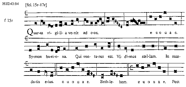 [MSD43:84; text: [fol. 15r-17r], f 15r, Quarta vigilia venit ad eos. euouae. Symon bariona. Qui venturus est. Vidimus stellam. In mandatis eius. Bethlehem. Post]