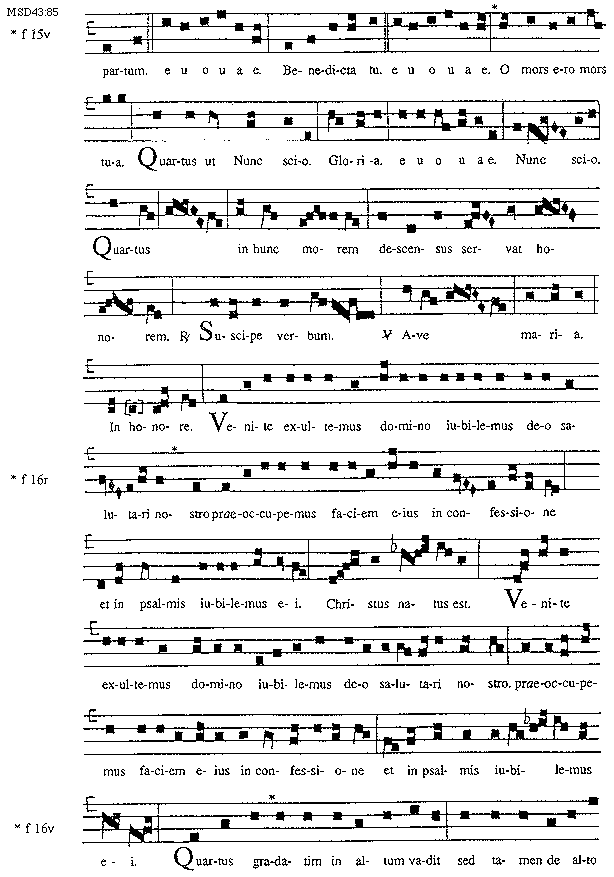 [85][MSD43:85; text: partum. Benedicta tu. euouae. f 15v, O mors ero mors tua. Quartus ut Nunc scio. Gloria. Nunc scio. Quartus in hunc morem descensus servat honorem. Responsorium Suscipe verbum. Versus Ave Maria. In honore. Venite exultemus domino iubilemus deo salutari nostro praeoccupemus faciem eius in confessione et in psalmis iubilemus ei. f 16r, Christus natus est. f 16v, Quartus gradatim in altum vadit sed tamen de alto]