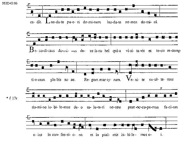 [86]{MSD43:85; text: cadit. Laudate pueri dominum laudate nomen domini. Benedictus dominus deus Israhel quia visitavit et fecit redemptionem plebis suae. Regem martyrum. Venite exultemus domino iubilemus deo salutari nostro praeoccupemus faciem eius in confessione et in psalmis iubilemus ei. f 17r]