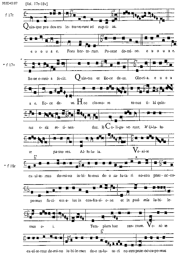 [87][MSD43:87; text: [fol. 17r-18v], f 17r, Quinque prudentes intraverunt ad nuptias. euouae. Fons hortorum. Ponent domino. f 17v, Bene omnia fecit. Quintus ut Ecce deus. Gloria. Ecce deus. Hoc clamore tonus tibi quintus erit retinendus. Responsorium Caligaverunt. Versus Ululate pastores. Alleluia. Venite exultemus domino iubilemus deo salutari nostro praeoccupemus faciem eius in confessione et psalmis iubilemus ei. f 18r, Templum hoc sanctum.]