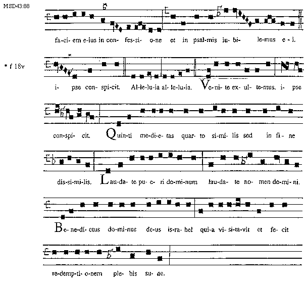 [88][MSD43:88; text: faciem eius in confessione et in psalmis iubilemus ei. ipse conspicit. f 18v, Alleluia alleluia. Venite exultemus. ipse conspicit. Quinti medietas quarto similis sed in fine dissimilis. Laudate pueri dominum laudate nomen domini. Benedictus dominus deus Israhel quia visitavit et fecit redemptionem plebis suae.]