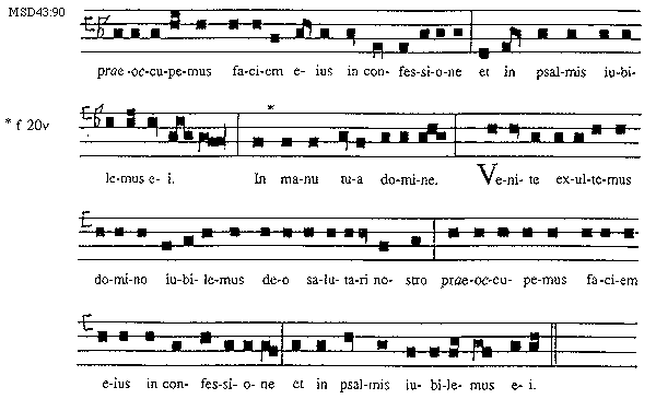 [90][MSD43:90; text: praeoccupemus faciem eius in confessione et in psalmis iubilemus ei. f 20v, In manu tua domine. Venite exultemus domino iubilemus deo salutari nostro praeoccupemus faciem eius in confessione et in psalmis iubilemus ei.]
