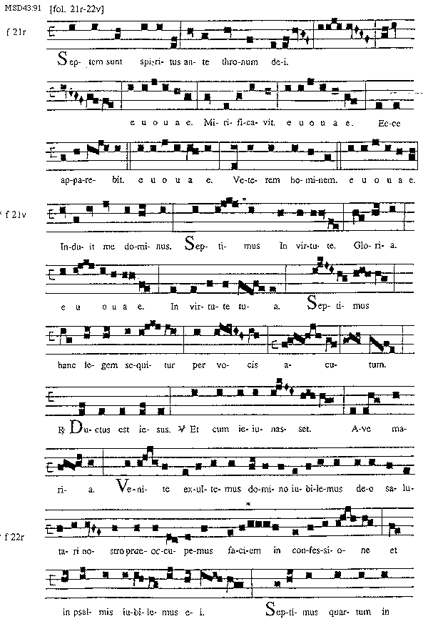 [91][MSD43:91; text: [fol. 21r-22v], f 21r, Septem sunt spiritus ante thronum dei. euouae. Mirificavit. Ecce apparebit. Veterem hominem. Induit me dominus. f 21v, Septimus In virtute. Gloria. In virtute tua. Septimus hanc legem sequitur per vocis acutum. Responsorium Ductus est Iesus. Versus Et cum ieiunasset. Ave Maria. Venite exultemus domino iubilemus deo salutari nostro praeoccupemus faciem in confessione et in psalmis iubilemus ei. f 22r, Septimus quartum in]