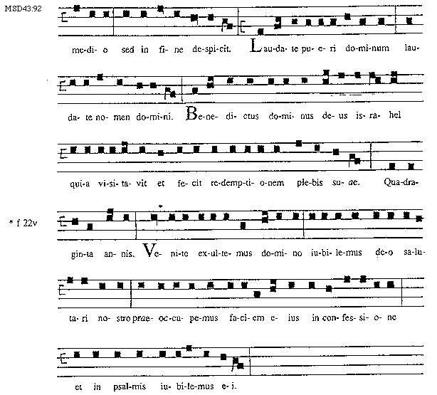[92][MSD43:92; text: medio sed in fine despicit. Laudate pueri dominum laudate nomen domini. Benedictus dominus deus Israhel quia visitavit et fecit redemptionem plebis suae. Quadraginta annis. f 22v, Venite exultemus domino iubilemus deo salutari nostro praeoccupemus faciem eius in confessione et in psalmis iubilemus ei.]