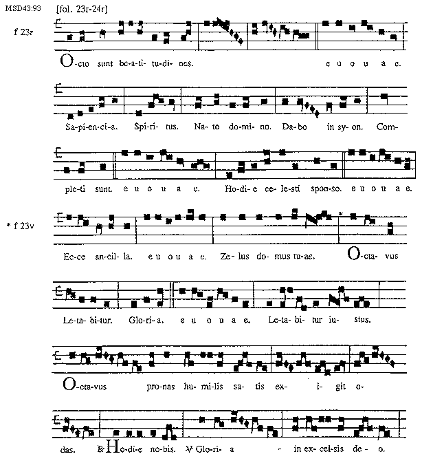 [MSD43:93; text: [fol. 23r-24r], f 23r, Octo sunt beatitudines. euouae. Sapiencia. Spiritus. Nato domino. Dabo in Syon. Completi sunt, Hodie celesti sponso. Ecce ancilla. Zelus domus tuae. f 23v, Octavus Letabitur. Gloria. Letabitur iustus. Octavus pronas humilis satis exigit odas. Responsorium x Hodie nobis. Versus Gloria in excelsis deo.]