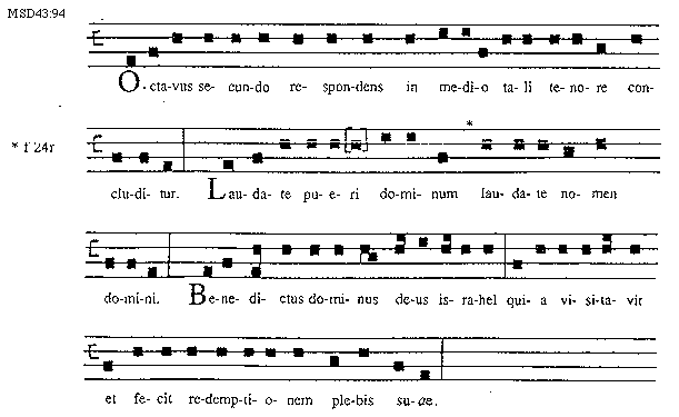 [94][MSD43:94; text: Octavus secundo respondens in medio tali tenore concluditur. Laudate pueri dominum laudate nomen domini. f 24r, Benedictus dominus deus Israhel quia visitavit et fecit redemptionem plebis suae.]