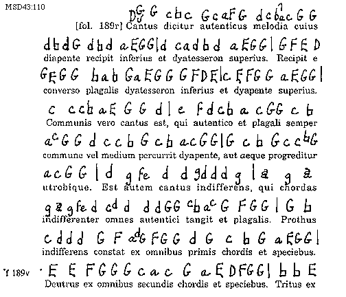 [110][MSD43:110; text: [fol. 189r] Cantus dicitur autenticus melodia cuius diapente recipit inferius et dyatesseron superius. Recipit e converso plagalis dyatesseron inferius et dyapente superius. Communis vero cantus est, qui autentico et plagali semper commune vel medium percurrit dyapente, aut aeque progreditur utrobique. Est autem cantus indifferens, qui chordas indifferenter omnes autentici tangit et plagalis. Prothus indifferens constat ex omnibus primis chordis et speciebus. f 189v, Deutrus ex omnibus secundis chordis et speciebus. Tritus ex, a, [sqb], c, d, e, f, g, D, E, F, G]
