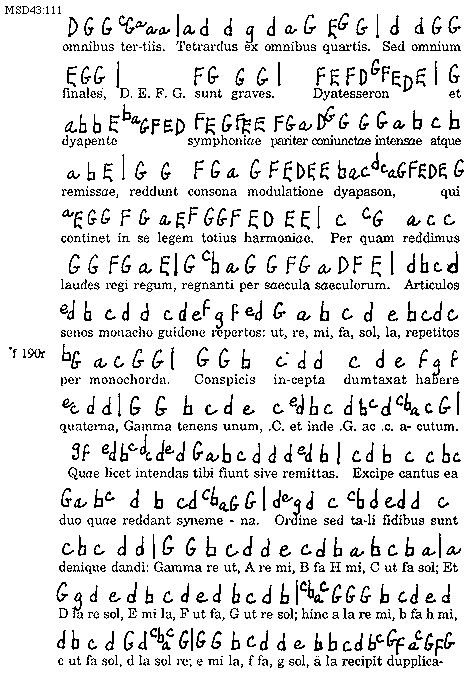 [111][MSD43:111; text: omnibus tertiis. Tetrardus ex omnibus quartis. Sed omnium finales, D. E. F. G. sunt graves. Dyatesseron et dyapente symphoniae pariter coniunctae intensae atque remissae, reddunt consona modulatione dyapason, qui continet in se legem totius harmoniae. Per quam reddimus laudes regi regum, regnanti per saecula saeculorum. Articulos senos monacho guidone repertos: ut, re, mi, fa, sol, la, repetitos per monochorda. f 190r, Conspicis incepta dumtaxat habere quaterna, Gamma tenens unum, .C. et inde .G. ac .c. acutum. Quae licet intendas tibi fiunt sive remittas. Excipe cantus ea duo quae reddant synemena. Ordine sed tali fidibus sunt denique dandi: Gamma re ut, A re mi, B fa H mi, C ut fa sol; Et D la re sol, E mi la, F ut fa, G ut re sol; hinc a la re mi, b fa h mi, c ut fa sol, d la sol re; e mi la, f fa, g sol, a la recipit dupplicata. a, [sqb], c, d, e, f, g, D, E, F, G]