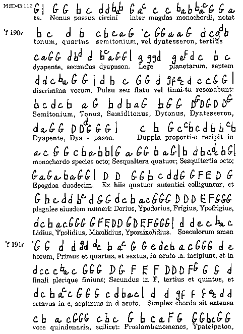 [112][MSD43:112; text: dupplicata. Nonus passus circini inter magdas monochordi, notat tonum, quartus semitonium, f 190v, vel dyatesseron, tertius dyapente, secundus dyapason. Lege planetarum, septem discrimina vocum. Pulsu seu flatu vel tinnitu resonabunt: Semitonium, Tonus, Semiditonus, Dytonus, Dyatesseron, Dyapente, Dyapason. Duppla proportio recipit in monochordo species octo; Sesqualtera quatuor; Sesquitertia octo; Epogdoa duodecim. Ex hiis quatuor autentici colliguntur, et plagales eiusdem numeri: Dorius, Ypodorius, Frigius, Ypofrigius, Lidius, Ypolidius, Mixolidius, Ypomixolidius. f 191r, Saeculorum amen horum, Primus et quartus, et sextus, in acuto .a. incipiunt, et in finali plerique finiunt; Secundus in F, tertius et quintus, et octavus in c, septimus in d acuto. Simplex chorda sit extensa voce quindenaria, scilicet: Proslambanomenos, Ypateipaton, a, [sqb], c, d, e, f, g, D, E, F, G]