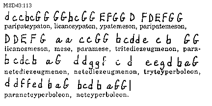 [113][MSD43:113; text: paripateypaton, licanosypaton, ypatemeson, paripatemeson, licanosmeson, mese, paramese, tritediezeugmenon, paranetediezeugmenon, netediezeugmenon, tryteyperboleon, paraneteyperboleon, neteyperboleon. a, [sqb], c, d, e, f, g, D, E, F, G]