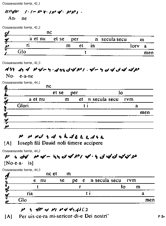 [Commemoratio brevis, 44,3; text: tonus, semitonium, Gloria et nunc et semper et in secula seculorvm amen, [Antiphona] Per uiscera misericordie Dei nostri [P 3v]]