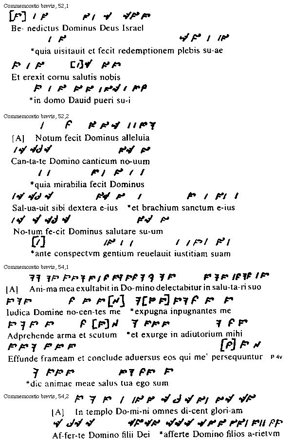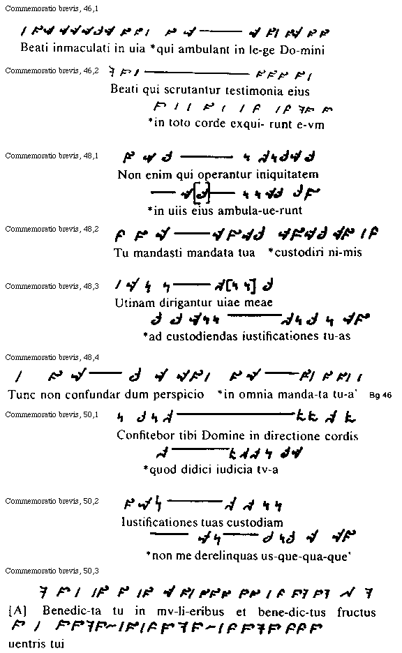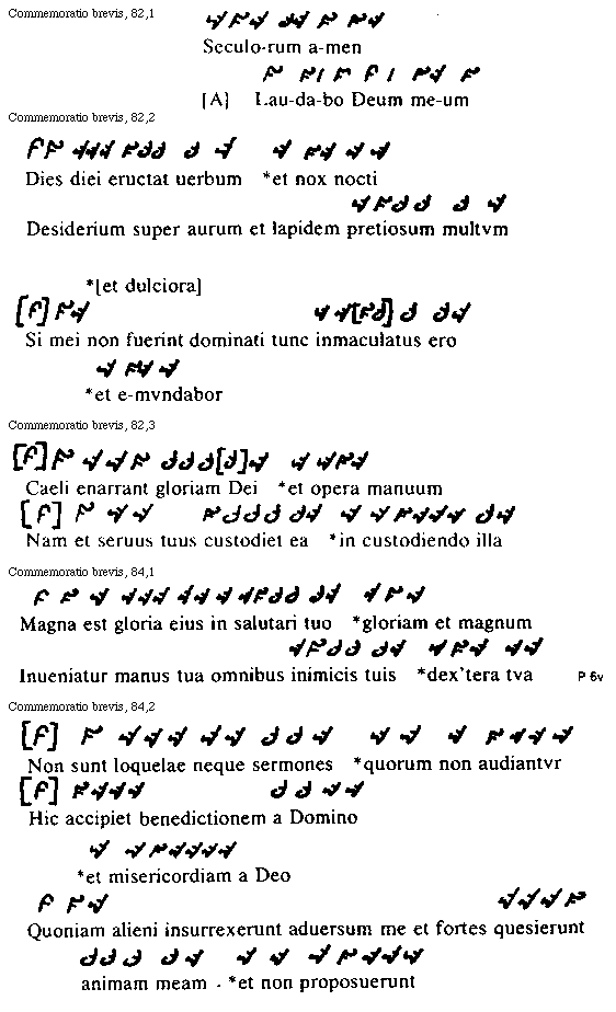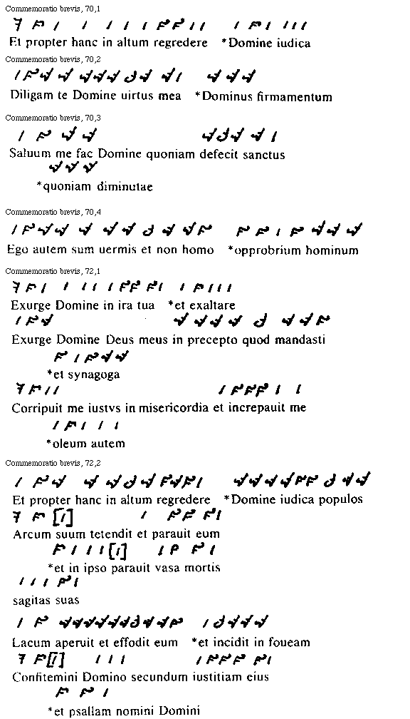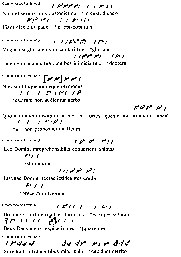 Preterea pro diuersitate antiphonarum quae psalmis adiunguntur, per omnes pene octo tonorum melodias finis uersuum uariatur, quarum diuersitatum in primo tono hae formae sunt: