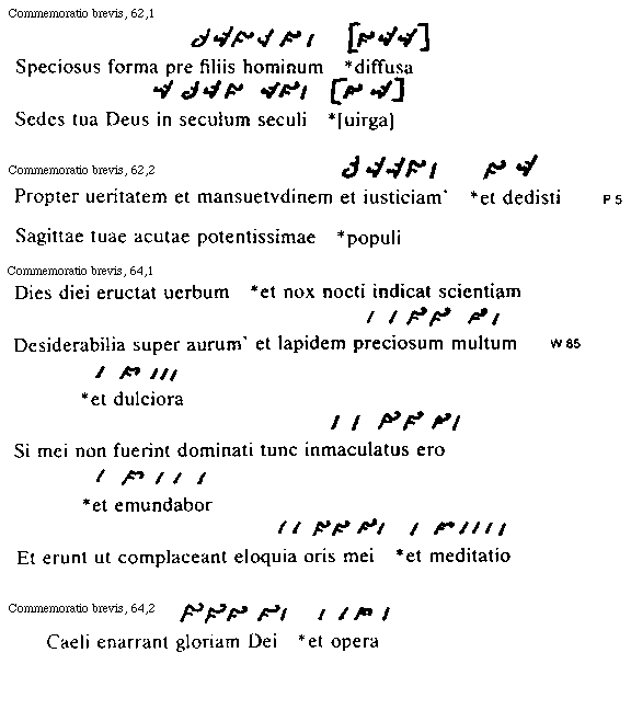 [Commemoratio brevis, 64,1; text: Dies diei eructat uerbum *et nox nocti indicat scientiam, Desiderabilia super aurum [W 85] et lapidem preciosum multum *et dulciora, Si mei non fuerint dominati tunc inmaculatus ero *et emundabor, Et erunt ut complaceant eloquia oris mei *et meditatio]