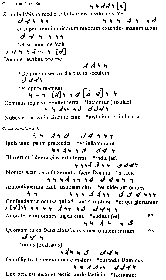 [92][Commemoratio brevis, 92; text: Ignis ante ipsum praecedet *et inflammauit, Illuxerunt fulgvra eius orbi terrae *vidit [et], Montes sicut cera fluxerunt a facie Domini *a facie, Annuntiauerunt caeli iusticiam eius *et uiderunt omnes, Confundantur omnes qui adorant sculptilia *et qui gloriantur, Adorate [P 7] eum omnes angeli eius *audiuit [et], Quoniam tu es Deus [W 8] altissimus super omnem terram *nimis [exaltatus], Qui diligitis Dominum odite malum *custodit Dominus, Lux orta est iusto et rectis corde laeticia *laetamini]