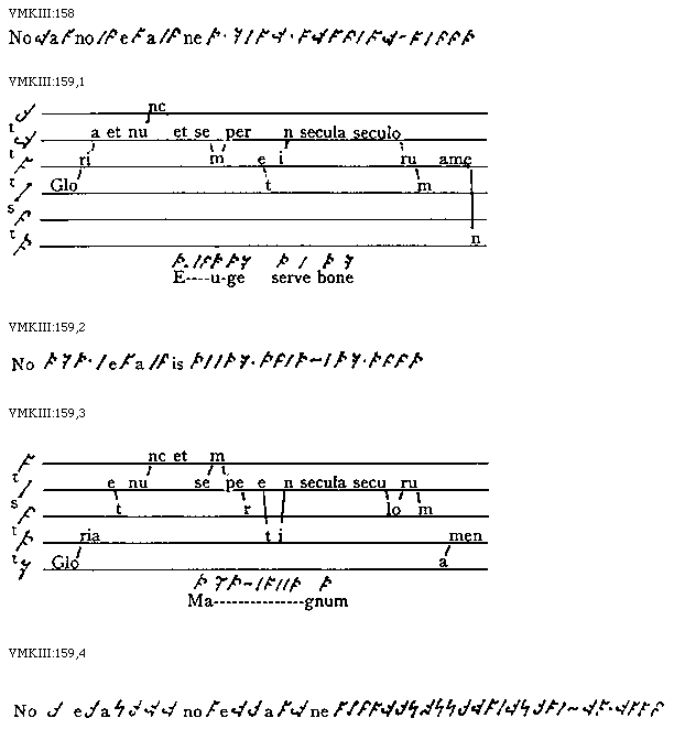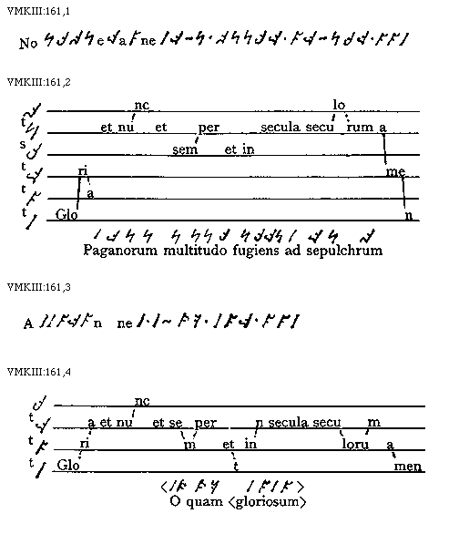 [VMKIII:161,2; text: tonus, semitonium, Gloria et nunc et semper et in secula seculorum amen, Paganorum multitudo fugiens ad sepulchrum]