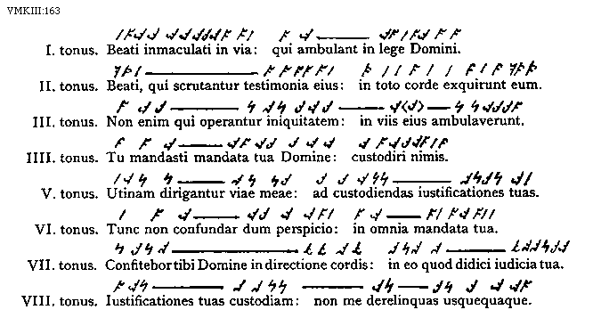 [VMKIII:163; text: Primus tonus. Beati inmaculati in via: qui ambulant in lege Domini. Secundus tonus. Beati, qui scrutantur testimonia eius: in toto corde exquirunt eum. Tertius tonus. Non enim qui operantur iniquitatem: in viis eius ambulaverunt. Quartus tonus. Tu mandasti mandata tua Domine: custodiri nimis. Quintus tonus. Utinam dirigantur viae meae: ad custodiendas iustificationes tuas. Sextus tonus. Tunc non confundar dum perspicio: in omnia mandata tua. Septimus tonus. Confitebor tibi Domine in directione cordis: in eo quod didici iudicia tua. Octavus tonus. Iustificationes tuas custodiam: non me derelinquas usquequaque.]