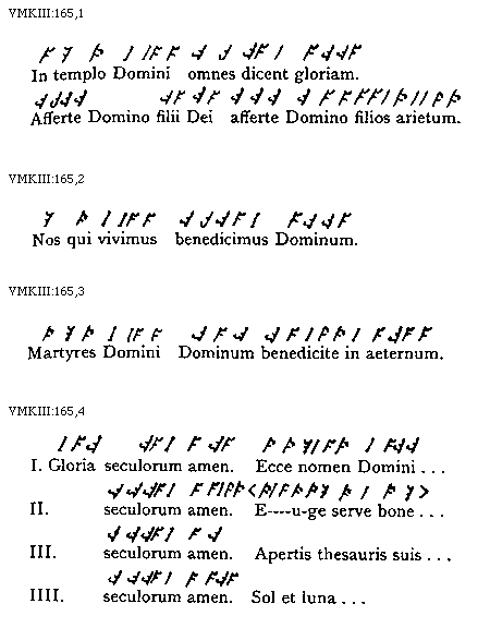 [VMKIII:165,4; text: I. Gloria seculorum amen Ecce nomen Domini, II. Euge serve bone, III. Apertis thesauris suis, IIII. Sol et luna]