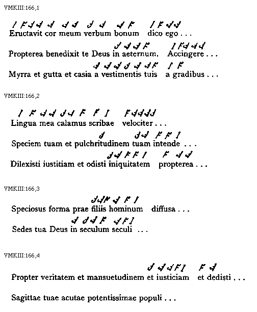 [VMKIII:166,1; text: Eructavit cor meum verbum bonum dico ego, Propterea benedixit te Deus in aeternum. Accingere, Myrra et gutta et casia a vestimentis tuis a gradibus]