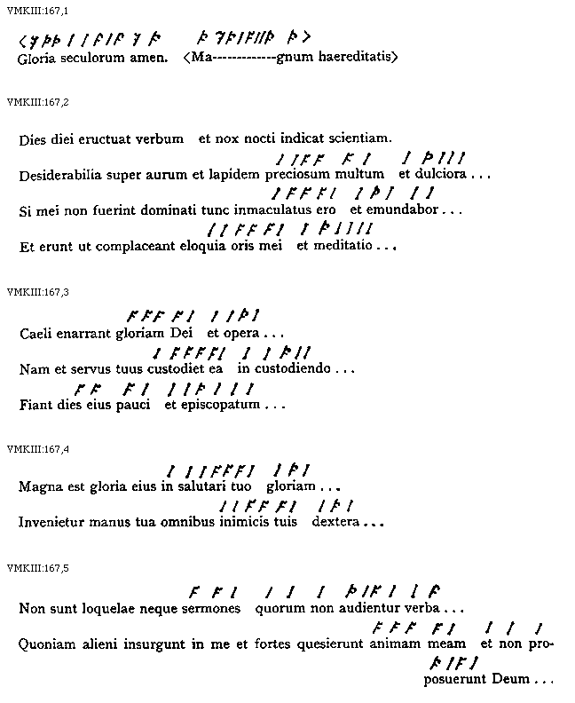 [VMKIII:167,2; text: Dies diei eructuat verbum et nox nocti indicat scientiam. Desiderabilia super aurum et lapidem preciosum multum et dulciora, Si mei non fuerint dominati tunc inmaculatus ero et emundabor, Et erunt ut complaceant eloquia oris mei et meditatio]