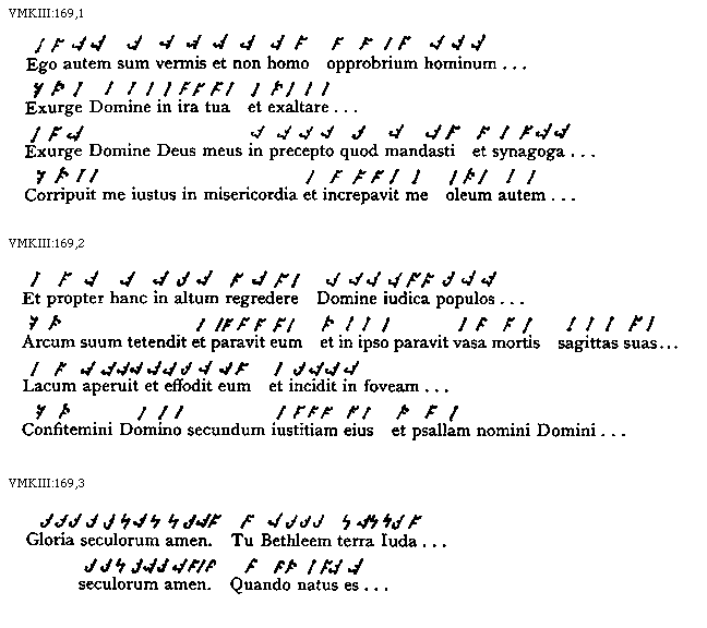 [VMKIII:169,1; text: Ego autem sum vermis et non homo opprobrium hominum, Exurge Domine in ira tua et exaltare, Exurge Domine Deus meus in precepto quod mandasti et synagoga, Corripuit me iustus in misericordia et increpavit me oleum autem]