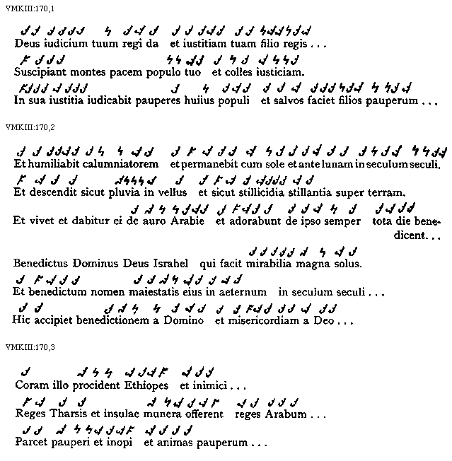 [VMKIII:170,2; text: Et humiliabit calumniatorem et permanebit cum sole et ante lunam in seculum seculi. Et descendit sicut pluvia in vellus et sicut stillicidia stillantia super terram. Et vivet et dabitur ei de auro Arabie et adorabunt de ipso semper tota die benedicent, Benedictus Dominus Deus Israhel qui facit mirabilia magna solus. Et benedictum nomen maiestatis eius in aeternum in seculum seculi, Hic accipiet benedictionem a Domino et misericordiam a Deo]