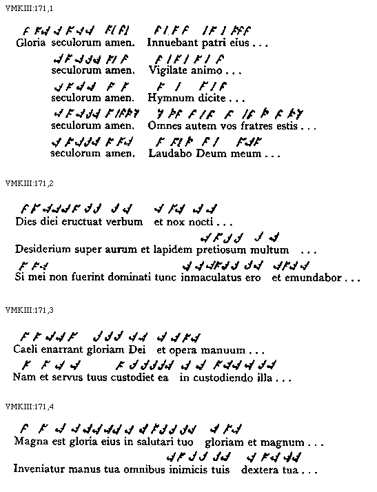 [VMKIII:171,1; text: Gloria seculorum amen. Innuebant patri eius, Vigilate animo, Hymnum dicite, Omnes autem vos fratres estis, Laudabo Deum meum]