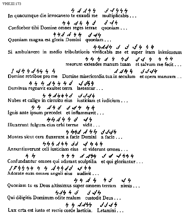 [173][VMKIII:173; text: In quacumque die invocavero te exaudi me multiplicabis, Confitebor tibi Domine omnes reges terrae quoniam, Quoniam magna est gloria Domini quoniam, Si ambulavero in medio tribulationis vivificabis me et super iram inimicorum meorum extendes manum tuam et salvum me fecit, Domine retribue pro me Domine misericordia tua in seculum et opera manuum, Dominus regnavit exultet terra laetentur, Nubes et caligo in circuitu eius iusticiam et iudicium, Ignis ante ipsum precedet et inflammavit, Illuxerunt fulgura eius orbi terrae vidit, Montes sicut cera fluxerunt a facie Domini a facie, Annuntiaverunt celi iusticiam eius et viderunt omnes, confundantur omnes qui adorant sculptilia et qui gloriantur, Adorate eum omnes angeli eius audivit, Quoniam tu es Deus altissimus super omnem terram nimis, Qui diligitis Dominum odite malum custodit Deus, Lux orta est iusto et rectis corde laeticia. Letamini]