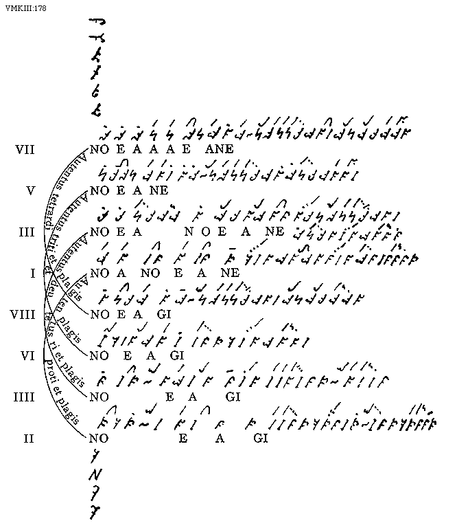 [VMKIII:178; text: VII, V, III, I, VIII, VI, IIII, II, NOEAEANE, NOEANE, NOEANOEANE, NOANOEANE, NOEAGI, Autentus tetrardi et plagis, Autentus triti et plagis, Autentus deuterus et plagis, Autentus proti et plagis]