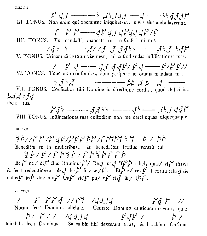 [217][GSI:217,1; text: Tertius tonus. Non enim qui operantur iniquitatem, in viis eius ambulaverunt. Quartus tonus. Tu mandasti, mandata tua custodiri nimis. Quintus tonus. Utinam dirigantur viae meae, ad custodiendas iustificationes tuas. Sextus tonus. Tunc non confundar, dum perspicio in omnia mandata tua. Septimus tonus. Confitebor tibi Domine in directione cordis, quod didici iudicia tua. Octavus tonus. Iustificationes tuas custodiam non me derelinquas usquequaque.]
