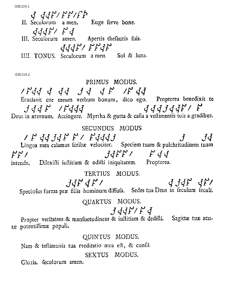 [GSI:219,2; text: Primus modus. Eructavit cor meum verbum bonum, dico ego. Propterea benedixit te Deus in aeternum. Accingere. Myrrha et gutta et casia a vestimentis tuis a gradibus. Secundus modus, Lingua mea calamus scribae velociter. Speciem tuam et pulchritudinem tuam intende. Dilexisti iustitiam et odisti iniquitatem. Propterea. Tertius modus. Speciosus forma prae filiis hominum diffusa. Sedes tua Deus in seculum seculi. Quartus modus. Propter veritatem et mansuetudinem et iustitiam et dedisti. Sagittae tuae acutae potentissimae populi. Quintus modus. Nam et testimonia tua meditatio mea est, et consilium, Sextus modus. Gloria. seculorum amen.]