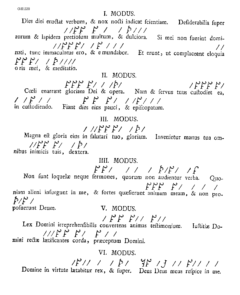 [220][GSI:220; text: Primus modus. Dies diei eructat verbum, et nox nocti indicat scientiam. Desiderabilia super aurum et lapidem pretiosum multum, et dulciora. Si mei non fuerint dominati, tunc immaculatus ero, et emundabor. Et erunt, ut complaceant eloquia oris mei, et meditatio. Secundus modus. Coeli enarrant gloriam Dei et opera. Nam et servus tuus custodiet ea, in custodiendo. Fiant dies eius pauci, et episcopatum. Tertius modus. Magna est gloria eius in salutari tuo, gloriam. Invenietur manus tua omnibus inimicis tuis, dextera. Quartus modus. Non sunt loquelae neque sermones, quorum non audientur verba. Quoniam alieni insurgunt in me, et fortes quaesierunt animam meam, et non proposuerunt Deum. Quintus modus. Lex Domini irreprehensibilis convertens animas testimonium. Iustitiae Domini rectae laetificantes corda, praeceptum Domini. Sextus modus. Domine in virtute laetabitur rex, et super. Deus Deus meus respice in me.]