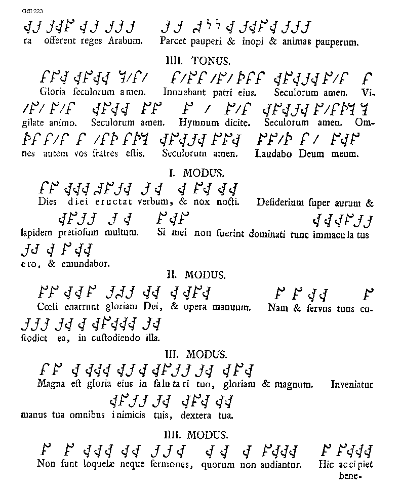 [223][GSI:223; text: offerent reges Arabum. Parcet pauperi et inopi et animas pauperum. Quartus modus. Gloria seculorum amen. Innuebant patri eius. Seculorum amen. Vigilate animo. Hymnum dicite. Omnes autem vos fratres estis. Laudabo Deum meum. Primus modus. Dies diei eructat verbum, et nox nocti. Desiderium super aurum et lapidem pretiosum multum. Si mei non fuerint dominati tunc immaculatus ero, et emundabor. Secundus modus. Coeli enarrunt gloriam Dei, et opera manuum. Nam et servus tuus custodiet ea, in custodiendo illa. Tertius modus. Magna est gloria eius in salutari tuo, gloriam et magnum. Inveniatur manus tua omnibus inimicis tuis, dextera tua. Quartus modus. Non sunt loquelae neque sermones, quorum non audiantur. Hic accipiet]
