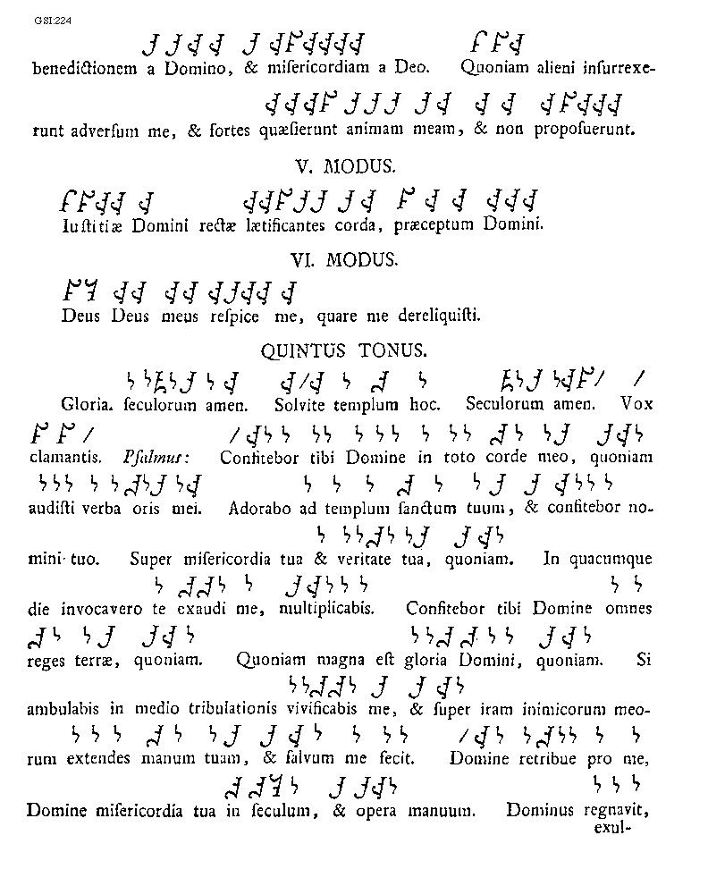 [224][GSI:224; text: benedictionem a Domino, et misericordiam a Deo. Quoniam alieni insurrexerunt adversum me, et fortes quaesierunt animam meam, et non proposuerunt. Quintus modus. Iustitiae Domini rectae laetificantes corda, praeceptum Domini. Sextus modus. Deus Deus meus respice me, quare me dereliquisti. Quintus tonus. Gloria. seculorum amen. Solvite templum hoc. Vox clamantis. Psalmus: Confitebor tibi Domine in toto corde meo, quoniam audisti verba oris mei. Adorabo ad templum sanctum tuum, et confitebor nomini tuo. Super misericordia tua et veritate tua, quoniam. In quacumque die invocavero te exaudi me, multiplicabis. Confitebor tibi Domine omnes reges terrae, quoniam. Quoniam magna est gloria Domini, quoniam. Si ambulabis in medio tribulationis vivificabis me, et super iram inimicorum meorum extendes manum tuam, et salvum me fecit. Domine retribue pro me, Domine misericordia tua in seculum, et opera manuum. Dominus regnavit,]