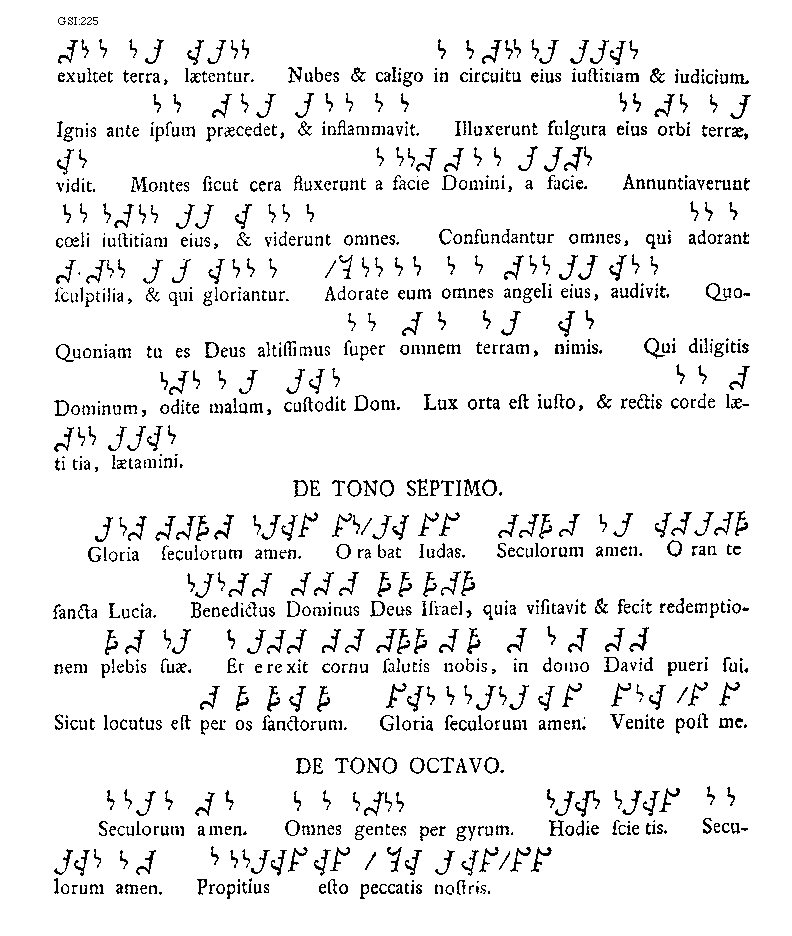 [225][GSI:225; text: exultet terra, laetentur. Nubes et caligo in circuitu eius iustitiam et iudicium. Ignis ante ipsum praecedet, et inflammavit. Illuxerunt fulgura eius orbi terrae, vidit. Montes sicut cera fluxerunt a facie Domini, a facie. Annuntiaverunt coeli iustitiam eius, et viderunt omnes. Confundantur omnes, qui adorant sculptilia, et qui gloriantur. Adorate eum omnes angeli eius, audivit. Quo-Quoniam tu es Deus altissimus super omnem terram, nimis. Qui diligitis Dominum, odite malum, custodit Dominus. Lux orta est iusto, et rectis corde laetitia, laetamini. De tono septimo. Gloria seculorum amen. Orabat Iudas. Orante sancta Lucia. Benedictus Dominus Deus Israel, quia visitavit et fecit redemptionem plebis suae. Et erexit cornu salutis nobis, in domo David pueri sui. Sicut locutus est per os sanctorum. Venite post me. De tono octavo. Omnes gentes per gryum. Hodie scietis. Seculorum amen. Propitius esto peccatis nostris.]