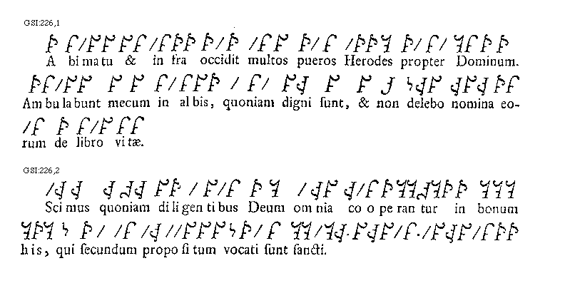 [GSI:226,1; text: A bimatu et infra occidit multos pueros Herodes propter Dominum. Ambulabunt mecum in albis, quoniam digni sunt, et non delebo nomina eorum de libro vitae.]