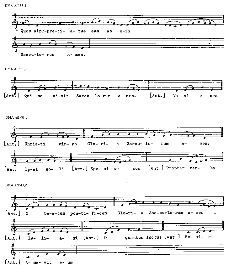 [DMA A/I:40,2; text: [Antiphona] O beatum pontificem, Gloria Saeculorum amen. Iuliani, O quantus luctus, Hodie, Amavit eum]