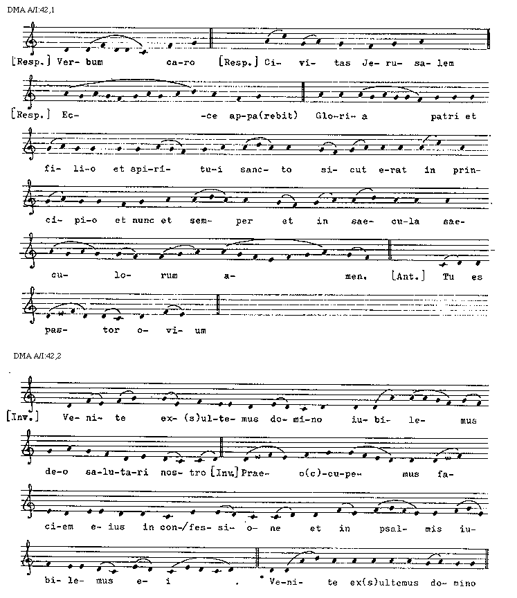 [42][f. 25v in marg.] [DMA A/I:42,1; text: [Responsorium] Verbum caro, Civitas Jerusalem, Ecce appa(rebit), Gloria patri et filio et spiritui sancto sicut erat in principio et nunc et semper et in saecula saeculorum amen. [Antiphona] Tu es pastor ovium]