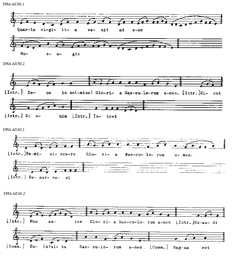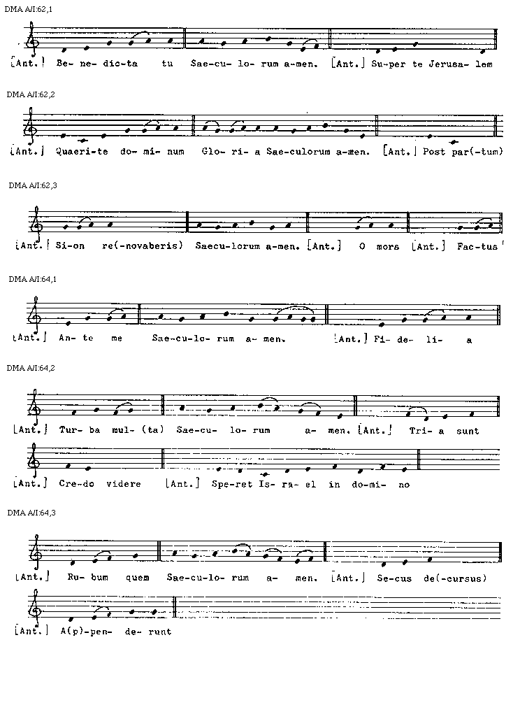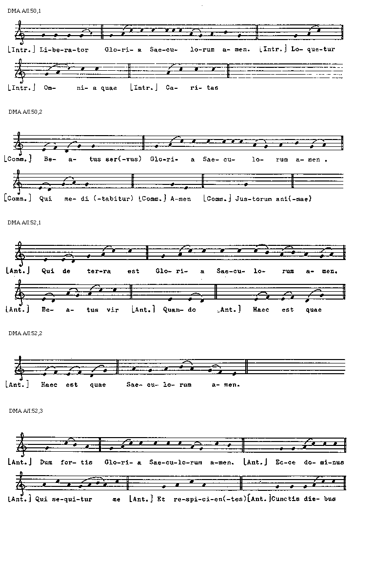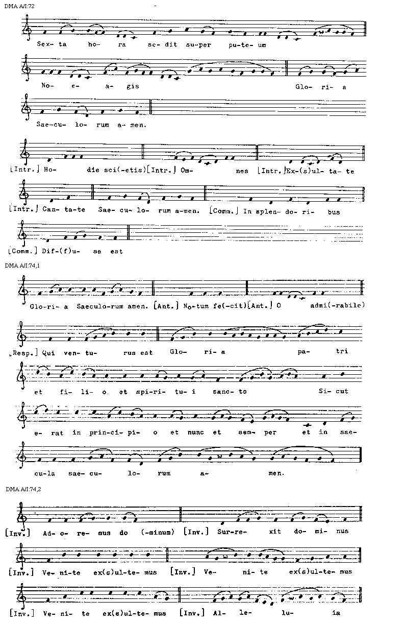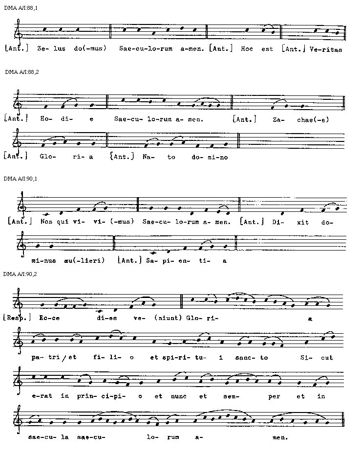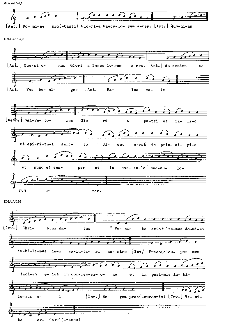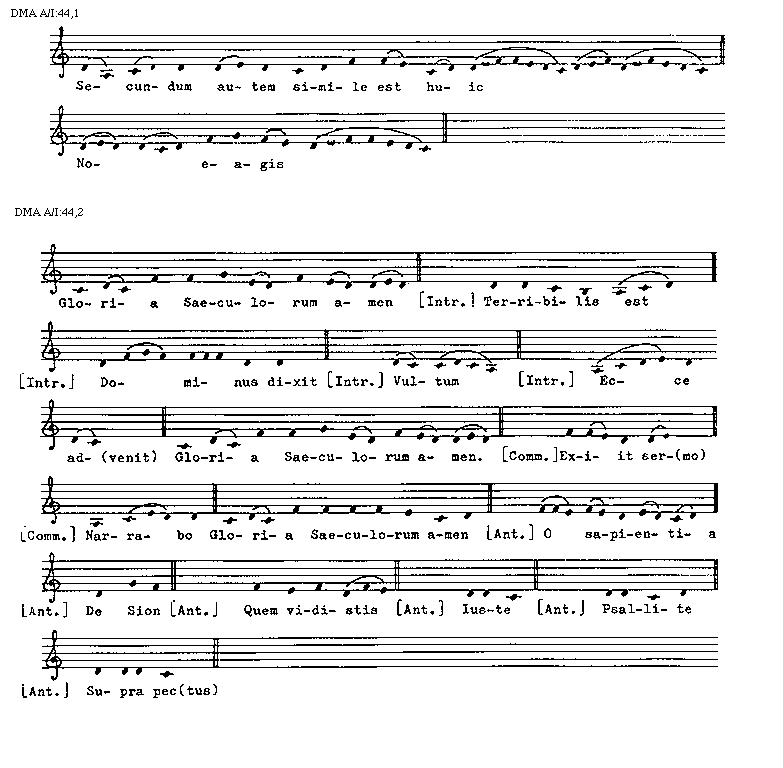 [DMA A/I:44,2; text: Gloria Saeculorum amen, Terribilis est, [Introitus] Dominus dixit, Vultum, Ecce ad(venit), Gloria Saeculorum amen. [Communio] Exiit ser(mo), Narrabo, Gloria Saeculorum amen, [Antiphona] O sapientia, De Sion, Quem vidistis, Iuste, Psallite, Supra pec(tus)]