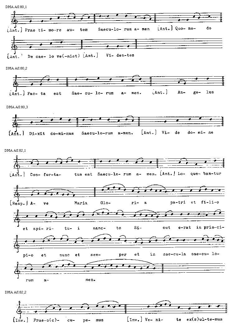 [DMA A/I:80,1; text: [Antiphona] Prae timore autem, Saeculorum amen, Quomodo, De caelo ve(niet), Videntes]