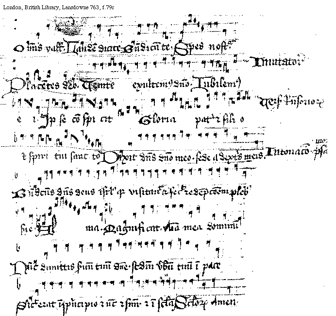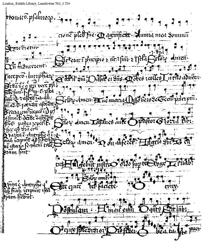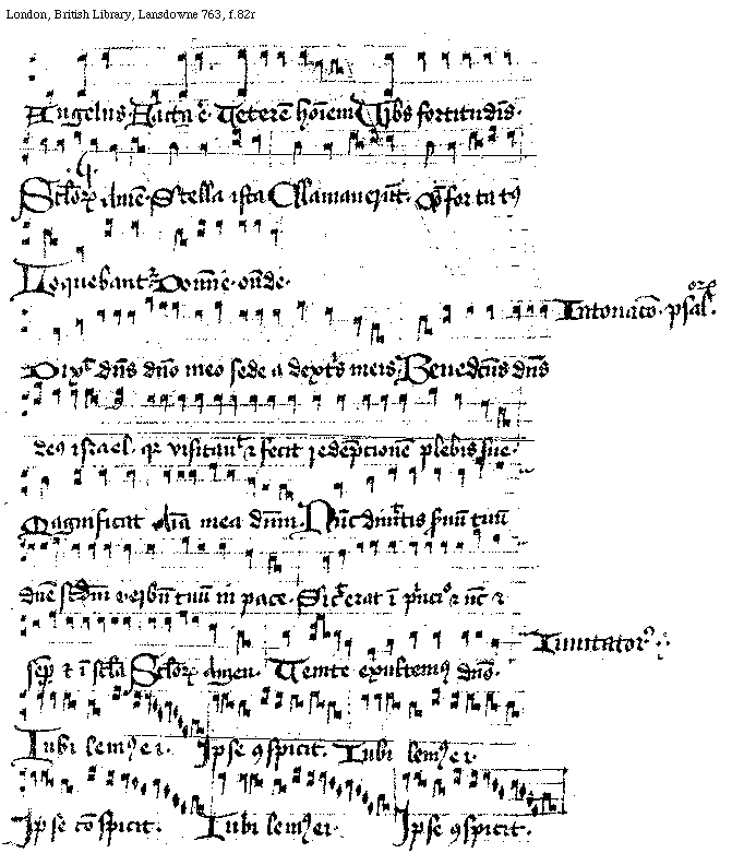 [London, British Library, Lansdowne 763, f.76v,2; text: Intonacio psalmorum, Dixit dominus domino meo sede a dextris meis. Benedictus dominus deus Israel. quia visitauit et fecit recempcionem plebis sue. Magnificat. Anima mea dominum. Nunc dimittis seruum tuum domine. Secundum verbum tuum in pace. Sicut erat in principio et nunc et semper et in secula, Seculorum Amen, prima differencia, Incepcio Antiphonarum. Nature, Lumine. ...uro virginum. Vigilate, Omnis terra, Tria sunt. Nos scientes, Laudabo, Impnum dicite.]