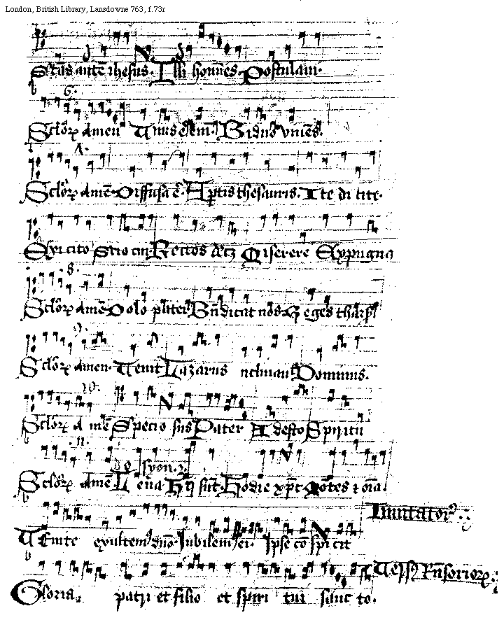[f.[[72]]73r][London, British Library, Lansdowne 763, f.73r; text: Stans autem Ihesus. Illi homines. Postulaui. sexta, Seculorum Amen, Vnus est enim. Biduo vniens. septa, Diffusa est. Apertis thesauris. Ite dicite. Exicito, Scio cui. Rectos decet, Miserere, Expugna, octaua, Dolo pater, Benedicat nos, Reges tharsis, nona, Venit, Lazarus, Inclinauit, Dominus. decima, Speciosus, Pater, Adesto, Spiritu, vndecima, De Syon .2. Leua, Hij sunt. Hodie Christus, Montes et omnia. Inuitatorium. Venite exultemus domino. Iubilemus ei. Ipse conspicit, Versus Responsoriorum. Gloria patri et filio et spiritui sancto.]