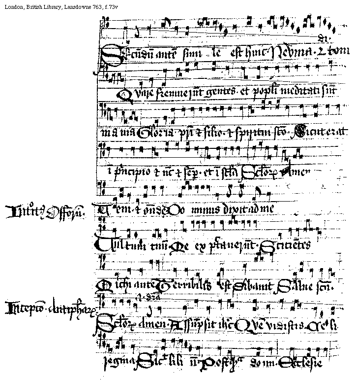 [London, British Library, Lansdowne 763, f.73v; text: SEcundum autem simile est huic. Neuma secundi toni. Quare fremuerunt gentes. et populi meditati sunt inania. Gloria. patri et filio. et spiritui sancto. Sicut erat in principio et nunc et semper. et in secula Seculorum Amen, Introitus Officiorum. Veni. et ostende. Dominus dixit ad me, Vultum tuum. Me expectauerunt. Scicientes, Michi autem, Terribilis est, Si vanit, Salue sancta. Incepcio Antiphonarum. prima differentia, Seculorum Amen. Assumpsit Ihesus, Quem vidistis. Celi regina. Sicut lilium. Postquam domi. Ecclesie]