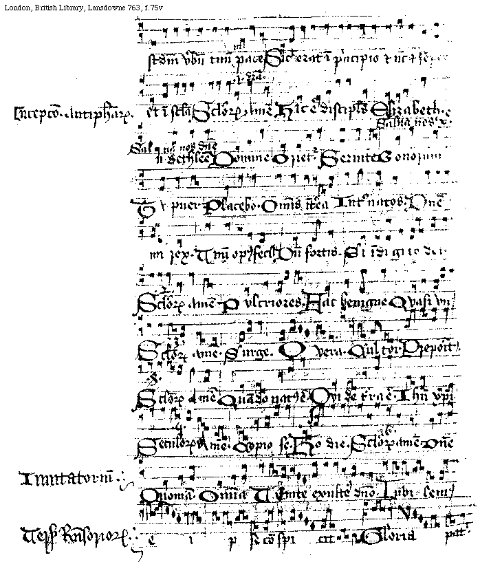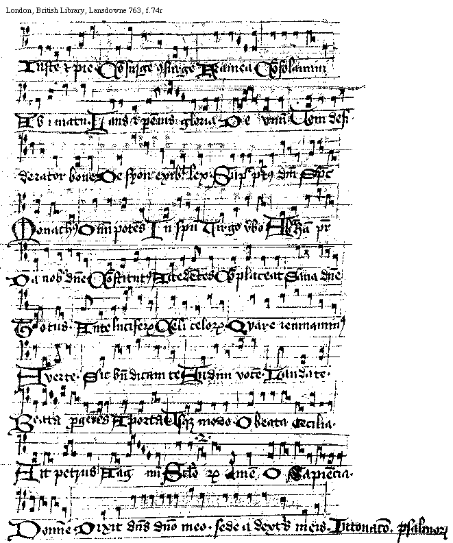 [f.[[73]]74r][London, British Library, Lansdowne 763, f.74r; text: Iuste et pie. Consurge consurge, Framea, Consolamini, Ab imatu. Laus et perennis gloria, De vnum. Veni desiderator bone. De syon exibit lex. Supra pectus domini, Spiritus, Monachus, Omnipotens, In spiritu, Virgo verbo. Ab hanc pater, Da nobis domine. Constitutus, Accedentes, Complaceat, Sana domine, Totus. Ante Luciferum. Celi celorum. Quare ieiunaminus, Auerte, Sic benedicam te, Audiui vocem. Laudate. Beata progenies, A porta, Vsque modo. O beata Cecilia. Ait Petrus, Aagnum. secunda, Seculorum Amen, O Sapiencia. Domine. Intonacio. Psalmorum, Dixit dominus domino meo. sede a dextris meis.]