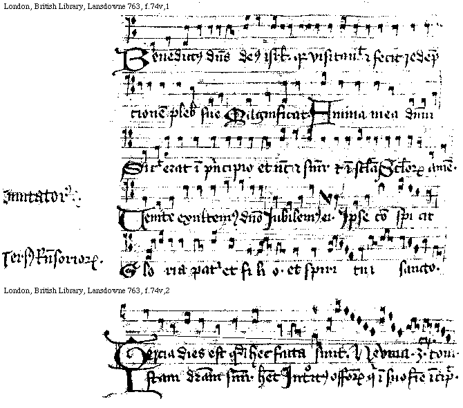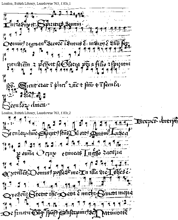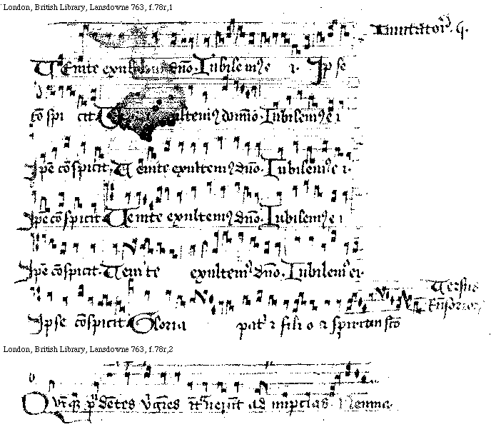 [London, British Library, Lansdowne 763, f.71v,1; text: Pater in filio. Filius in patre. Spiritus sanctus Ab vtroque procedens. Primum. querite regnum dei Neuma. primi toni]