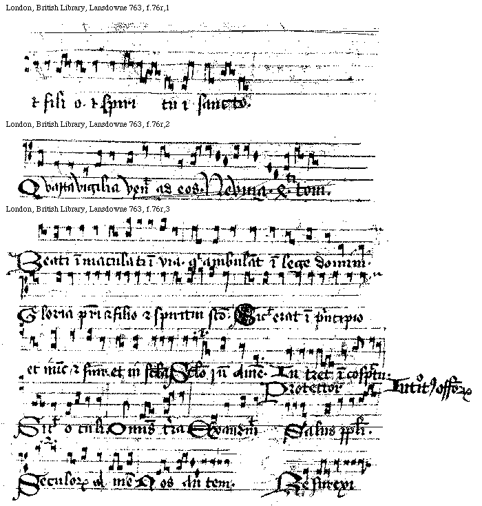 [London, British Library, Lansdowne 763, f.76r,3; text: Beati immaculati in via. qui ambulant in lege domini. Gloria patri et filio et spiritui sancto. Sicut erat in principio et nunc et semper. et in secula Seculorum Amen. prima, Introitus officiorum. [Protector add. sub lin.], Intret in conspectu. Sicut oculi. Omnis terra, Exaudiuit, Salus populi. secunda, Nos autem. Resurexi]